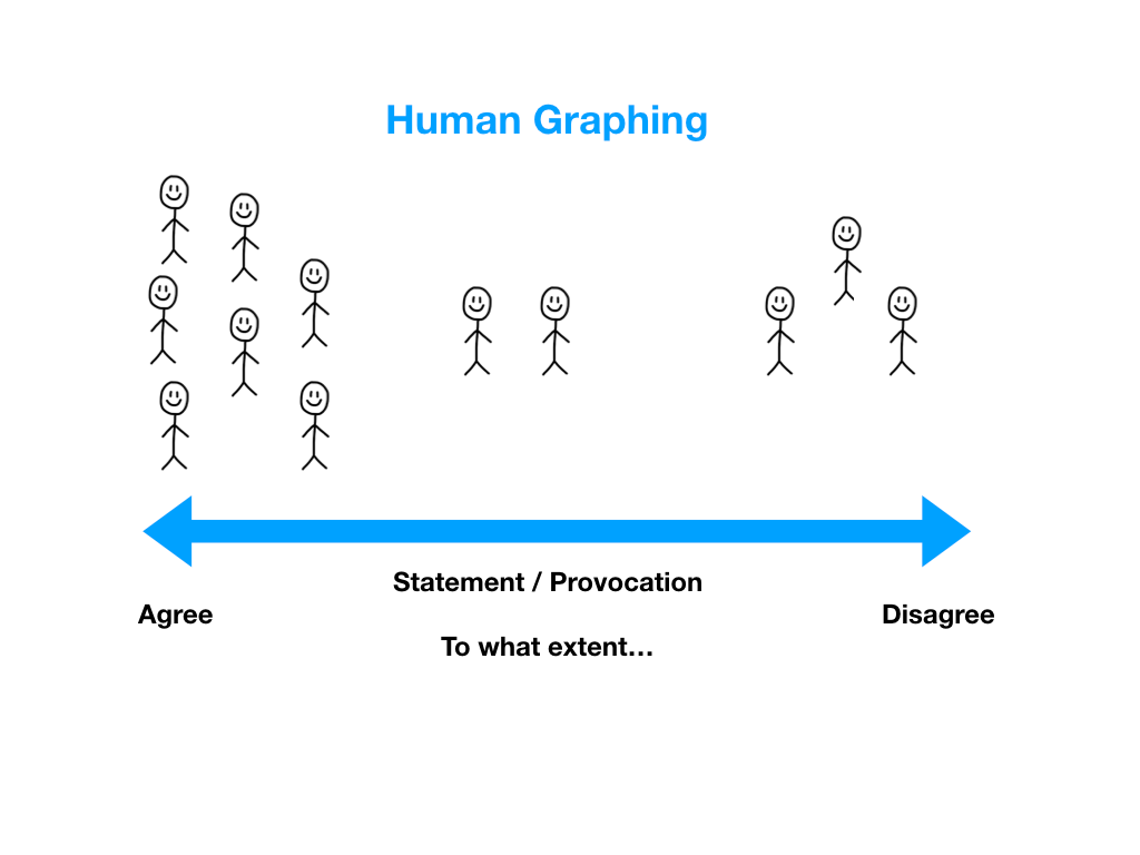 - Continuum Graphing – On one side of the classroom have the label ‘strongly agree’ and on the other side have the label strongly disagree. On a presentation slide, put up a statement where students must choose to agree or disagree. Students then stand at various points along the continuum from one side of the classroom to the other based on their agreement or disagreement level.